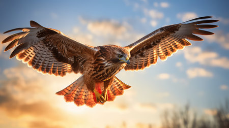 As the sun casts a warm, golden glow across the rolling hills, a majestic hawk soars gracefully through the tranquil sky. This powerful bird of prey embodies the spirit of freedom and the untamed beauty of the natural world, captured in a moment of serene flight.