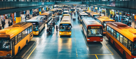 modern city bus terminal, many buses at station, public transport depot and parking, EV electric vehicle transportation. High quality photo