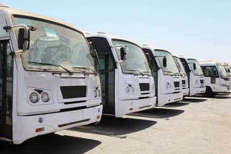 Large public transport buses in the parking lot. Lots of white buses in the parking lot.