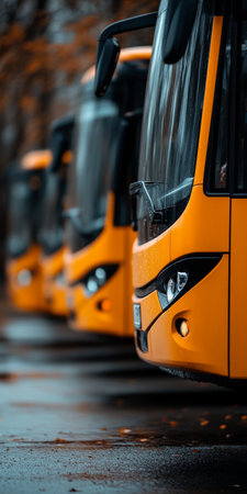 bus depot in the evening, with buses parked and lights off, created with generative ai