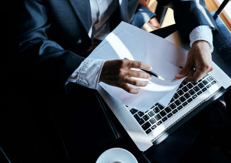 Business man sitting in a cafe in front of a laptop documents coffee cup executive top view technology lifestyle