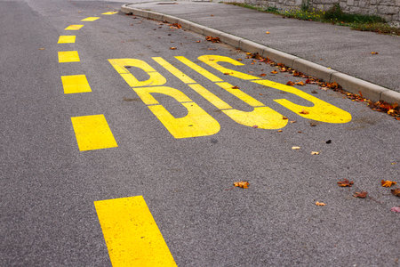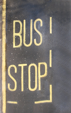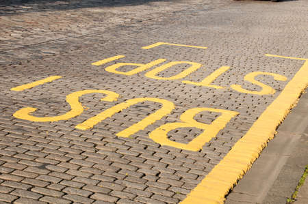 Bus stop text written and yellow line on the road in middle of the asphalt road, Bus stop word on street.
