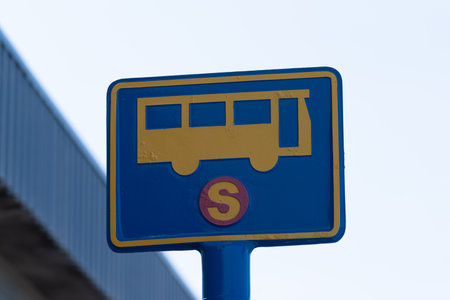 Bus stop sign in Reykjavik, Iceland. Modern public transport. Bus stop in the city street. Bus station. Traffic signs.