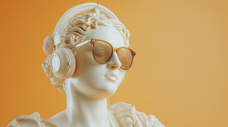 Classical sculpture listening music on headphones and wearing sunglasses on an orange background. Contemporary art collage concept