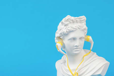 Creative image of a plaster statue of Apollo with headphones on a blue background. minimal concept. creative photo.