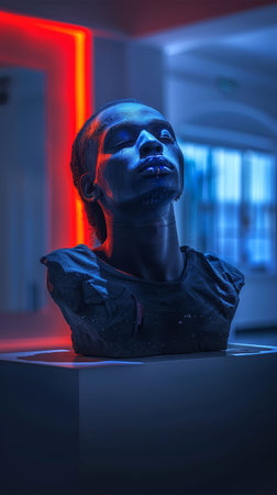 A smooth bald mannequin displays a serene expression with its profile illuminated by a striking turquoise light creating a vivid contrast.