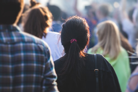 A huge crowd of people in the city rushes about their business during the day, selective focus.