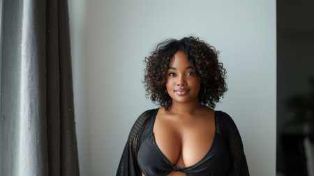 A stunning portrait of a confident plus-size woman with curly hair, standing by a window and exuding elegance and confidence.
