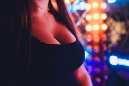 neckline, beautiful large female breast, dress, close-up.