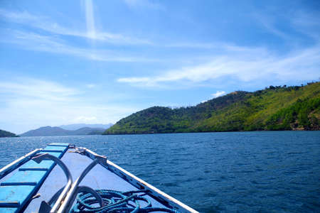 A view from a boat travelling towards big forested island in the Philippines archipelago. Isle is surrounded by the blue, calm waters of the ocean and azure, clear sky.