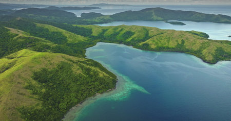Fiji islands: Aerial view tropical islands adorned with lush green vegetation, by crystal clear turquoise water and coral reefs in Fiji. Wild nature travel landscape. Drone flight