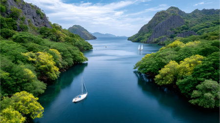 Sailboats journeying through a serene bay between lush green tropical islands
