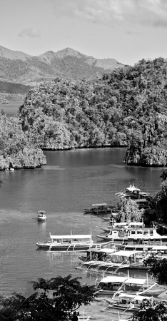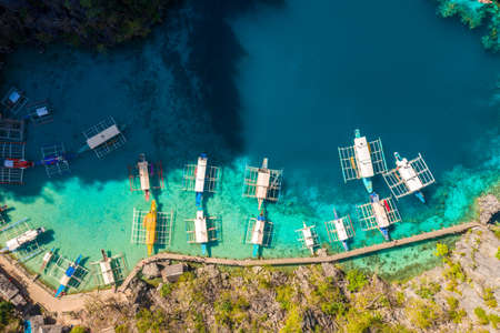 Many boats in the turquoise lagoon, view from above.Seascape with blue bay and boats. traditional Filipino wooden outrigger boat called a banca. Summer and travel vacation concept