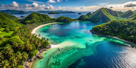Aerial view of a breathtaking tropical archipelago with crystal-clear waters and lush greenery