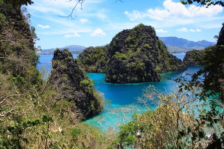 Aerial view of beautiful lagoons and limestone cliffs on Coron, Palawan, Philippines.