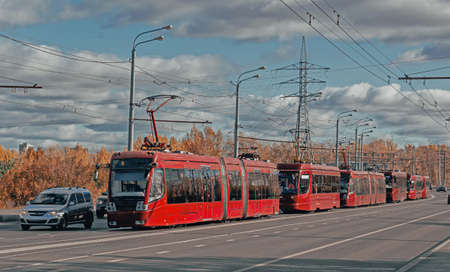 A lot of red modern city trams in Kazan. Public transportation concept. City background banner.