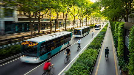 A bus trans Jakarta crosses the middle of Jakarta Indonesia's road, on the left and right of the road, there are shady trees, making the road more comfortable for vehicles to pass.