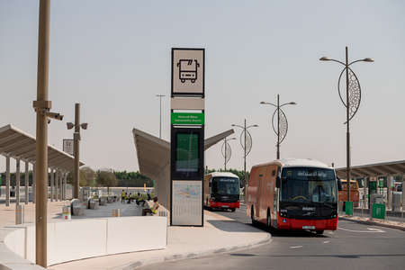Dubai, United Arab Emirates - November 06, 2021: Buses bring tourists to the World Expo 2020 in DUBAI