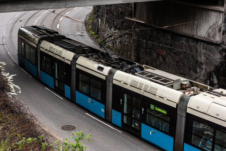 Gothenburg, Sweden - May 16 2021: Tram on line 10 on its way up the hill between Chalmers and Wavrinskys.