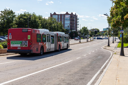 Ottawa, Canada - August 2, 2021: Public bus OC transpo from Ottawa on the road in Gatineau city of Quebec, Canada