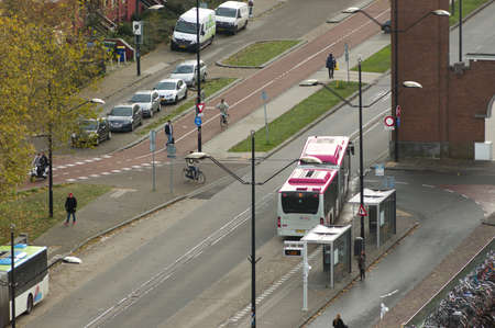 Nijmegen, Netherlands - November 22, 2019: Bus on the road for transport people at Nijmegen station seen from above