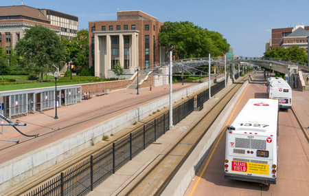 MINNEAPOLIS, MN/USA - SEPTEMBER 10, 2017: Metro Green light rail and bus line on Washington Avenue at the University of Minnesota.