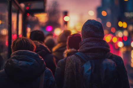 A diverse group gathers silently at dusk, their breath visible in chilly air, illuminated by ambient city glow and vibrant streaks of twilight reflecting a tranquil