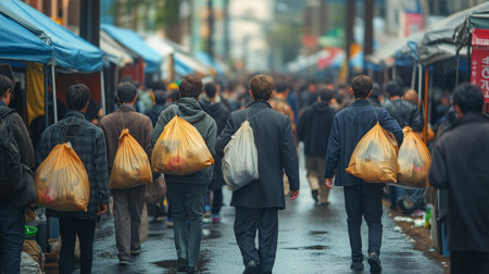 A group of people seen from behind walking through a bustling street market, each carrying a filled bag, creating a scene of urban daily life and commerce.