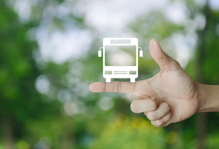 Bus flat icon on finger over blur green tree background, Business transportation service concept