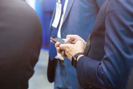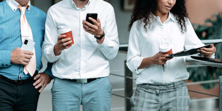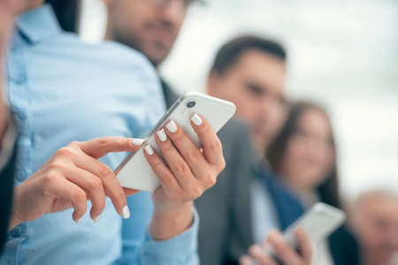 Business people using mobile phones together standing in office. Close up shot of human hands holding smartphones. Blurred image. Selective focus on female hand in foreground.