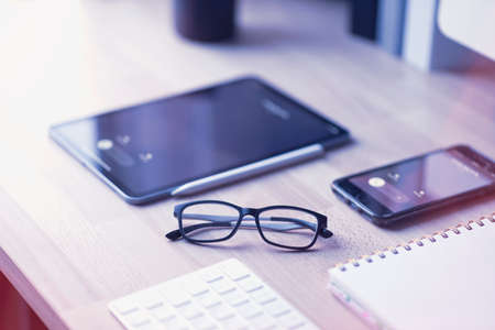 Laptops, mobile phones and notebooks on a working table in creative office. Successful teamwork and business startup concept.