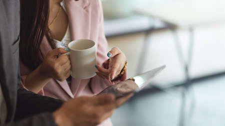 Close up view of two businesspeople hands holding tablet and coffee cup while consulting on their work