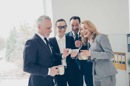 Portrait of four attractive, cheerful, stylish business persons using smart phone, watching funny, comic video, photo, drinking coffe, tea, enjoying leisure, standing in work place, station