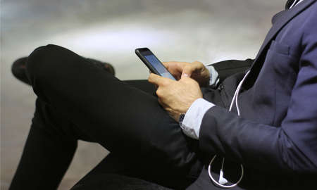 A man in a suit uses his smartphone. Close-up of hands. Business and Communication