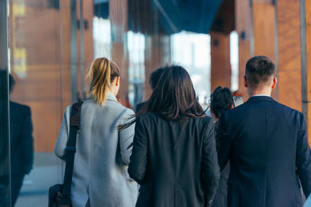 Group of colleagues on a business trip (euro trip) walking together at a modern futuristic station
