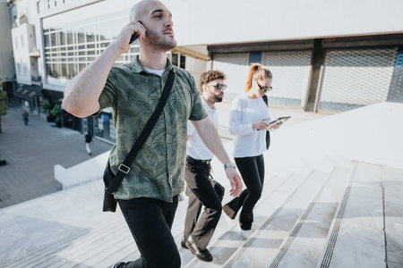 High Angle Shot of Office Managers and Business People Commuting to Work in the Morning or from Office on a Sunny Day on Foot. Pedestrians are Dressed Smartly. Successful People Talking on Mobile.