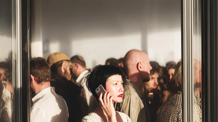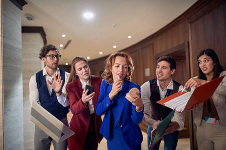 group of employees trying to reach their boss which is putting lipstick in a hallway