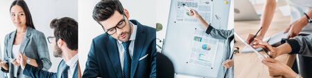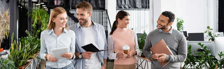 Positive multicultural businesspeople with digital tablet, coffee to go and notebook in office, banner