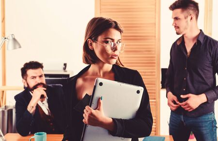 Office collective concept. Sexual attraction. Stimulate sexual desire. Sexual attention. Making career in male club office. Woman working in mostly male workplace. Woman attractive working with men