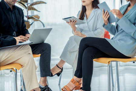 Business people proficiently discuss work project while sitting in circle . Corporate business team collaboration concept .