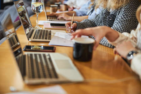 Business people working on laptop computers. Group of entrepreneurs or corporate employees sitting in office and using modern notebook PCs to develop digital marketing projects. Cropped shot, closeup