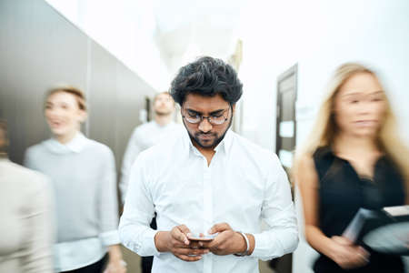Young African male employee in formal clothes standing in the office. Group of people working behind with smartphones. Job concept.