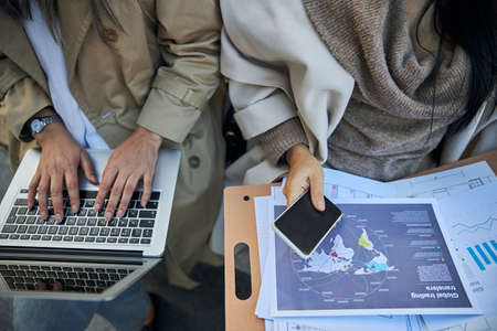 Close up of businesswoman holding smartphone and folder with papers while her colleague using laptop