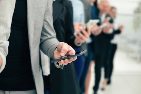 A group of diverse employees with smartphones standing in a row