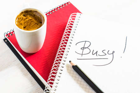 On the table near the laptop is a notebook in which the word work is written. Top view layout of a daily work plan