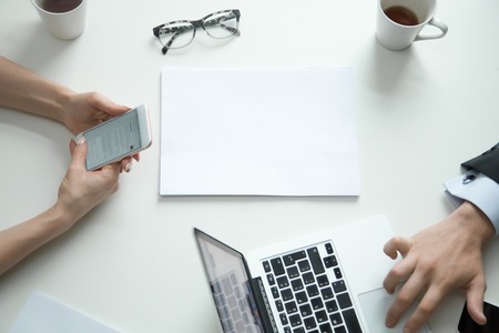Top view of a white office desk, female hands with phone, male texting on the laptop, modern workplace, blank paper with copy space for text. Business concept photo, close up