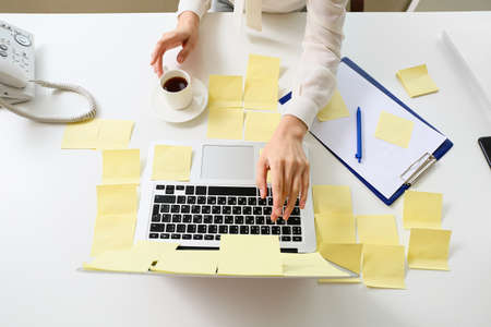 Close up businesswoman working with laptop and taking notes at office. business financial concept