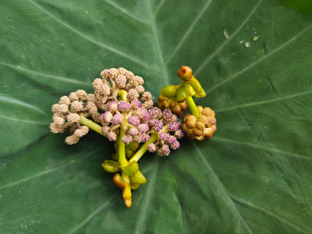 Bunch of flowers on a green leaf in the rainforest.