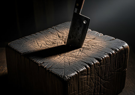 Dark, low key studio shot of a heavily scarred, rustic wooden butcher block with a large, sharp cleaver knife blade stuck deep into the surface. focus on texture and dramatic lighting.