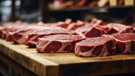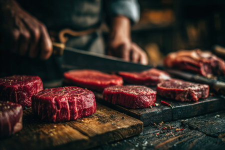 Slices of red meat are arranged on a wooden board, with a knife in action, highlighting the freshness and quality of the beef in a cozy kitchen setting